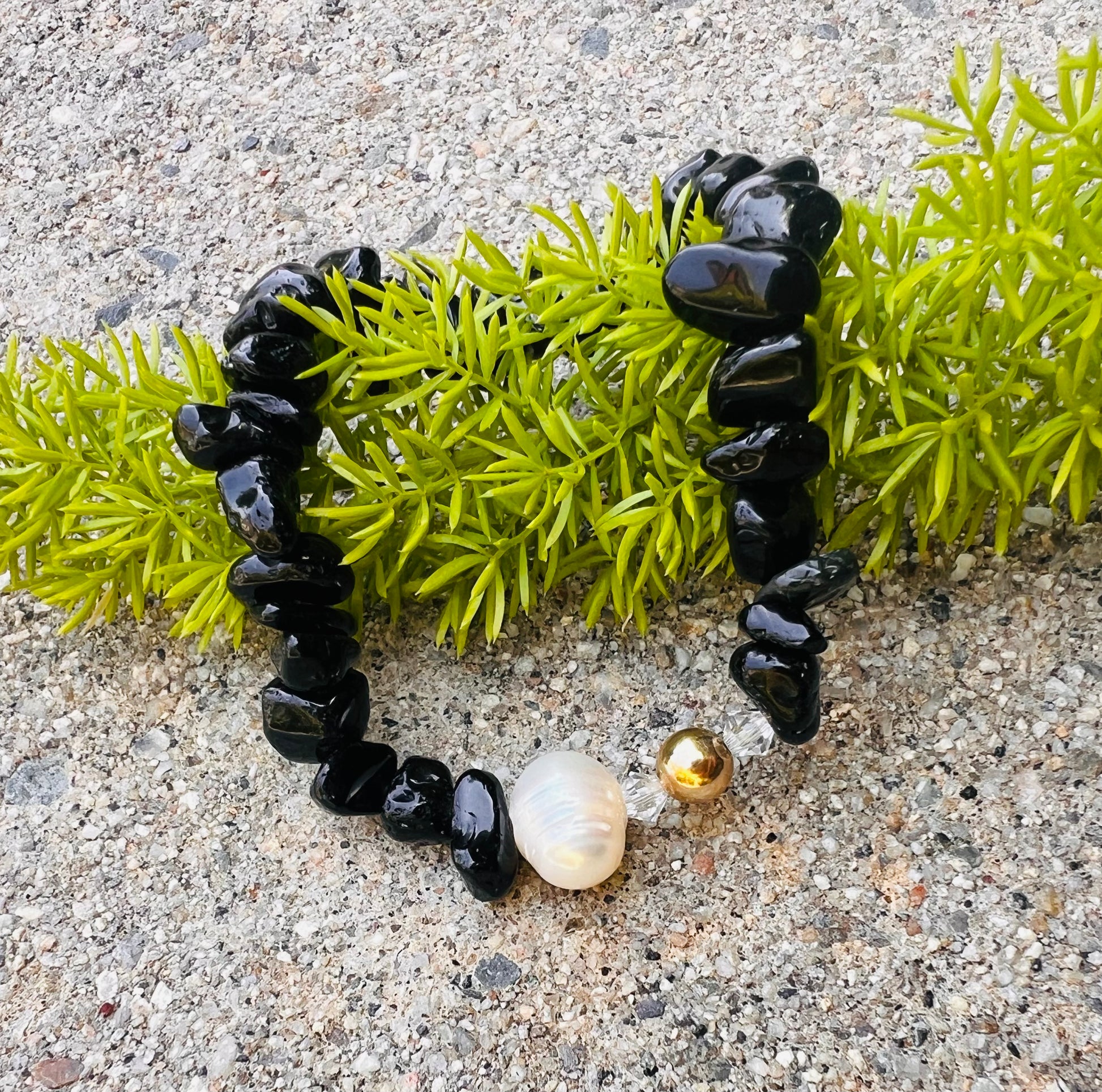 Beautiful natural stone bracelets made from a variety of stones . Milky opal, black obsidian , amber, and many more. With a beautiful fresh water pearl , Cristal and gold filled.